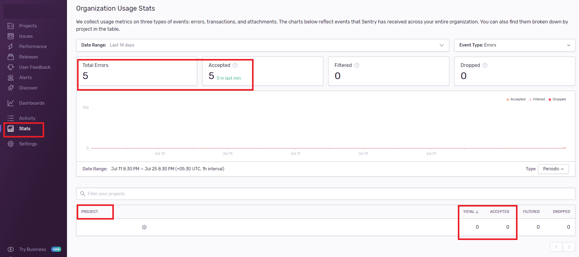 I have a single project under organization. The Organization Usage Stats page shows Errors thrown from above statement but the same are not shown under project section of Organization Usage Stats page. Also, Issues tab does not show any Error.